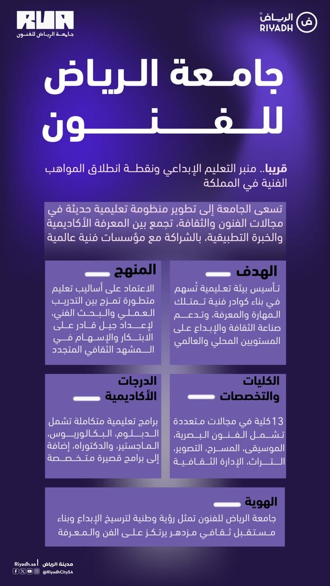 صدر أمر ملكي كريم باعتماد تأسيس "جامعة الرياض للفنون" لتكون أول جامعة متخصصة بمجالات الثقافة والفنون تحت إشراف وزارة الثقافة الجامعة بتبدأ انطلاقتها بثلاث كليات أساسية وهي المسرح والفنون الأدائية والموسيقى والأفلام ومخطط إنها تتوسع مستقبلاً لتشمل 13 كلية منها الفنون البصرية والعمارة والتصميم والأزياء والإدارة الثقافية