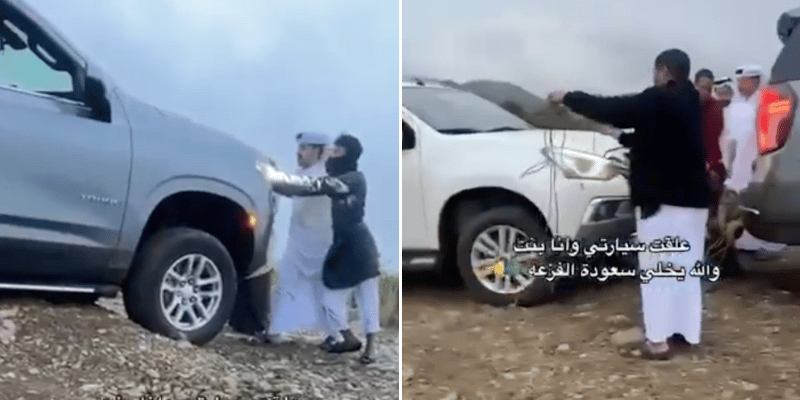 6 رجال يساعدون فتاة تعطلت سيارتها بمنطقة وعرة